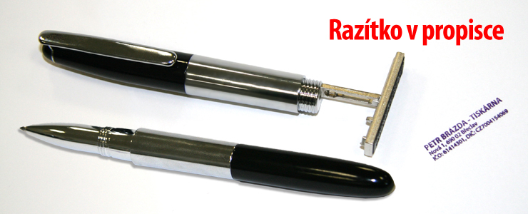Nebaví vás nosit sebou velké razítka? Nevadí! Vyrobíme Vám praktické razítko v propisce, které budete mít vždy po ruce a nebo Vám můžeme zhotovit i „kapesní“ razítko. Další výhodou těchto razítek je jejich odolnost a vysoká životnost. Tyto razítka vydrží až 20.000 otisků oproti klasickému razítku, které vydrží jen 5.000 – 7.000 otisků, nevysychají. V případě že potřebujete na razítku vyměnit některé údaje, vyměníme vám pouze otisk. Již nemusíte kupovat nové razítko.